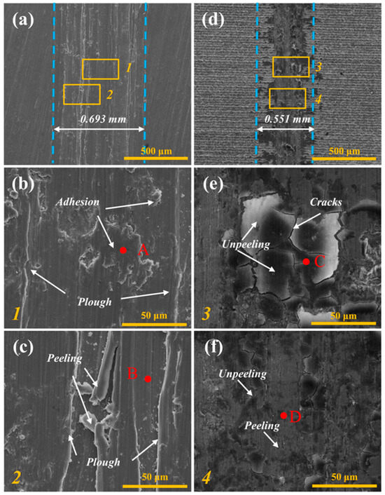 Worn morphology characteristics: (a–c) A0 sample, (d–f) N0 sample.