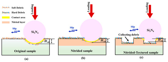 Schematic diagram of the wear mechanism of the FLN-FLT-treated surface. (a) the original sample, (b) the nitrided sample, (c) the nitrided-textured sample.