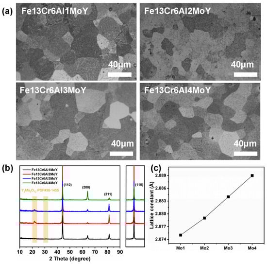microstructure of the as-fabricated Fe13Cr6Al(1–4)Mo0.15Y alloy (a) with corresponding XRD profiles (b) and lattice constant (c).