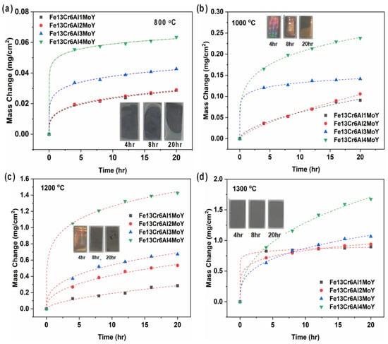 High-temperature oxidation weight gain curves covering the temperature regime of 800–1300 °C ((a–d) corresponding to 800–1300 °C).