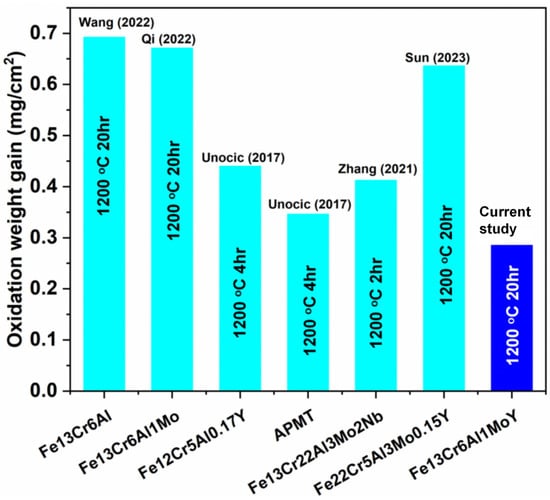 The final oxidation weight gain of the Fe13Cr6Al1Mo0.15Y used in the current study oxidized at 1200 °C for 20 h as compared to alloys in the literature [1,4,7,43,44].