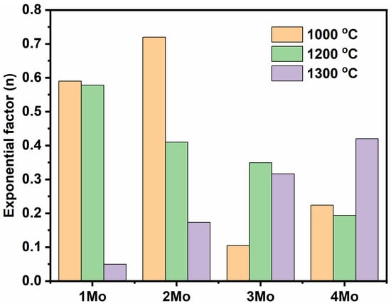 Exponential factor of the weight gain curves for Fe13Cr6Al(x = 1–4)Mo0.15Y alloys subjected to high-temperature steam oxidation fitted by the exponential model.