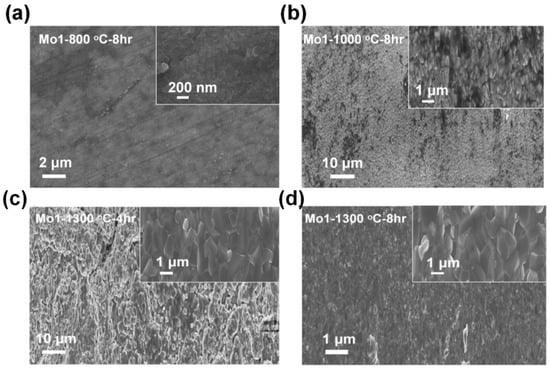 Surface microstructure morphology of the sample coupon (Fe13Cr6Al1Mo0.15Y) post-high-temperature steam oxidation under variable temperature and time: (a,b) 800 °C and 1000 °C oxidized for 8 h; 1300 °C oxidized for 4 h (c) and 8 h (d).