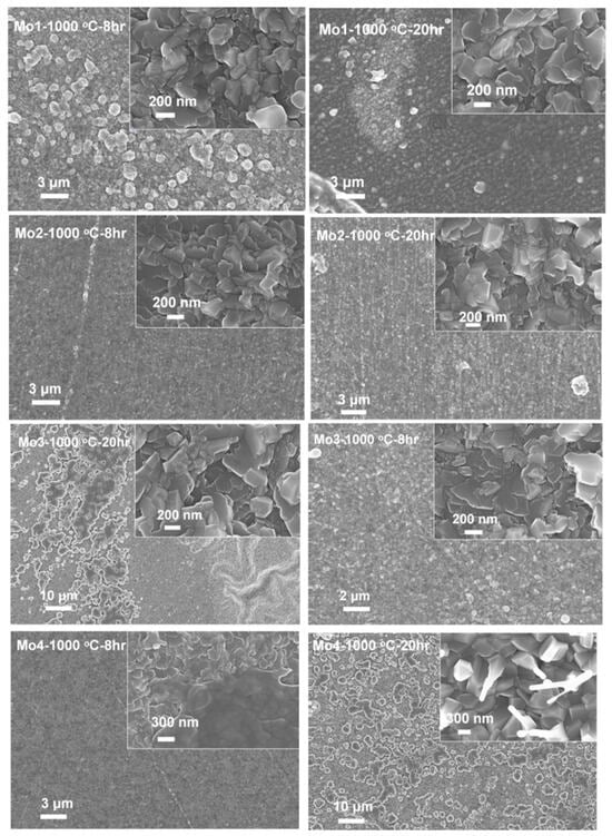 Surface microstructure evolution of the FeCrAlMoY alloy (Mo = 1–4) post-high-temperature (1000 °C) steam oxidation under variable time regimes.