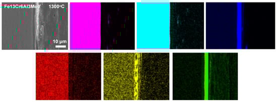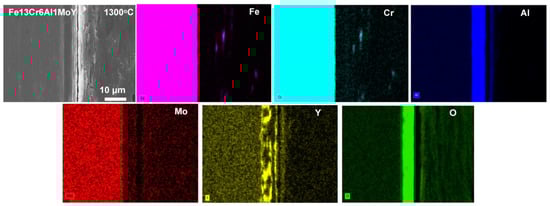The cross-sectional microstructure and elemental distribution of Fe13Cr6Al1Mo0.15Y and Fe13Cr6Al3Mo0.15Y after steam oxidation at 1300 °C for 20 h can be seen in Figure 7 and Figure 8. The Fe-, Cr- and Mo-enriched oxidation layers generally formed on the alloy surface at low temperature and then gradually diminished upon elevating the temperature to 1300 °C, after which the film becomes thick oxidation layers (around 8–10 µm) enriched with Al, Y, and O. Trace amounts of Fe and Cr can be seen on top of the oxidation film because the majority of the Fe and Cr have been vaporized [1]. Although the chemical composition of the oxidation film is not intrinsic and strongly depends on the oxidation environment, the surface-oxidation film demonstrates high-temperature stability with a uniform oxidation film tightly attached to the matrix, with lower convolution or spallation compared to our previous research on pure FeCrAl alloy [1]. The homogeneous chemical and microstructural properties of the oxidation film can further increase the high-temperature stability of the alloy by protecting the underlying matrix from rapid oxidation due to the shielding effect, even at an extremely high temperature of 1300 °C, which is far above the cladding ballooning and burst point [6].