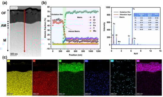 STEM analysis of the Fe13Cr6Al1Mo0.15Y post-1200 °C steam oxidation. (a) HAADF mode of the STEM image of the cross-section; (b) elemental line scanning, and (c) the corresponding mappings of the cross-section.