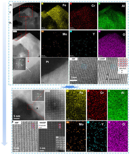 High r-esolution STEM analysis of the Fe13Cr6Al1Mo0.15Y post-1200 °C steam oxidation. Top surface of the oxidation layer featuring multiple crystalline structures and the corresponding elemental mappings used on the multiple layer surface-oxidation layer; STEM analysis of alteration zone beneath the top oxidation layer (zone a) with LAADF and ABF modes and the corresponding elemental mappings.