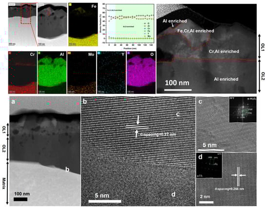 The thermodynamically driven rapid growth of the surface-oxidation film with a thickness of approximately 7 µm realized by increasing the oxidation temperature to 1300 °C is shown in Figure 12. Unlike FeCrAlMoY oxidized at 1200 °C, the surface-oxidation layer lacks heterogeneity, with the majority of the layer being Al- and O-enriched and a minor amount of Y nanoparticles being randomly spread on the oxidation layer, as shown in the cross-sectional elemental mappings in Figure 12 and Figure 13. The rapid increase in the film thickness does not compromise the film mechanical structure since the oxidation film is closely attached to the matrix without convolution, in contrast to the monolithic FeCrAl alloy, as demonstrated by the bright-field image. The oxidation film features both equiaxed and columnar grains with high crystallinity and grain sizes of approximately 3 µm due to grain coarsening; these grains are significantly larger than those of the film oxidized at 1200 °C, suggesting that the grain growth is thermodynamically driven. A distinct interface can be seen between the oxidation film and the matrix with Al and O enrichment, as shown by the elemental line scanning and mappings in Figure 8. However, the existence of both equiaxed and columnar grains in the bright-field STEM image further suggests the heterogeneous nature of the oxidation film, which might have a distinct crystalline structure from the top down to the bottom. The columnar grains in the figure are Al- and O-enriched and can be identified as α-Al2O3 according to the high-resolution image and FFT image. In addition, nanocrystalline Al2O3 with a grain size of approximately 3–4 nm coexists with the micron-grain-size oxidation product, as evidenced by the hollow rings in the FFT image in Figure 13. A sandwich structure with a Y- and Mo-enriched crystalline layer between two Al2O3 oxidation layers with a thickness of approximately 1 µm each can be observed in the HAADF image and elemental mappings. The Y- and Mo-enriched layer can be further identified as Y2Mo3O12 with a d-spacing equal to 0.62 nm based on the high-resolution STEM image along the [0-1-0] zone axis, showing lattice expansion compared to α-Al2O3. The oxidation layer beneath the Y2Mo3O12 layer is Al- and O-enriched and shares the same crystalline structure as the top oxidation layer, as confirmed by the elemental mappings and selective area diffraction pattern (SADP) in Figure 13. A distinct interface between the oxidation layer and the underlying matrix can be seen in the high-resolution STEM image in Figure 14, which shows highly crystalline structures on both sides, as also confirmed by the SADP and corresponding FFT patterns in Figure 14. The matrix underneath the oxidation layer shares a similar crystalline structure to that of Fe2CrAl, with a corresponding d-spacing of 0.525 nm, which is greater than that of the monolithic FeCrAl alloy [1,4], suggesting the probability of lattice expansion. Furthermore, some nanoclusters, identified as Mo or Y oxides with grain sizes of approximately 300–500 nm, are randomly distributed on the altered matrix of the sample post-1300 °C oxidation, as demonstrated by the elemental mappings, which might be attributed to thermodynamically driven element segregation and grain enlargement at this temperature compared to 1200 °C. The details are discussed in the following section.