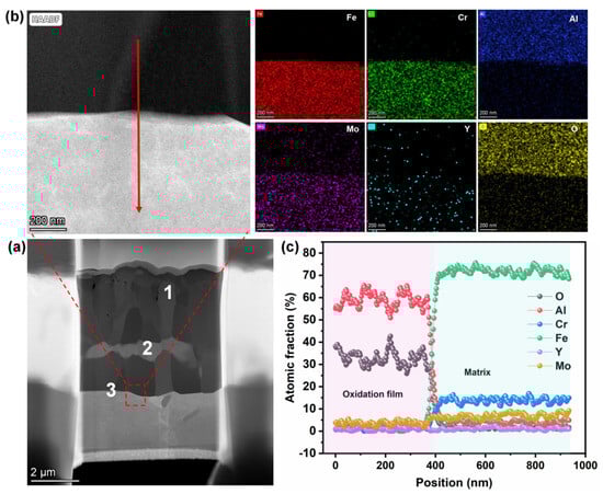 Cross-section elemental analysis (line scanning and mapping) of the Fe13Cr6Al1Mo0.15Y post-1300 °C steam oxidation for 20 h. (a) HAADF image of the surface-oxidation film; (b) HAADF image of the oxidation film/matrix interface and (c) corresponding elemental line scanning (red arrow in figure b) and mappings. (1–3) the image zones corresponding to the Figure 13 (zone 1–3).