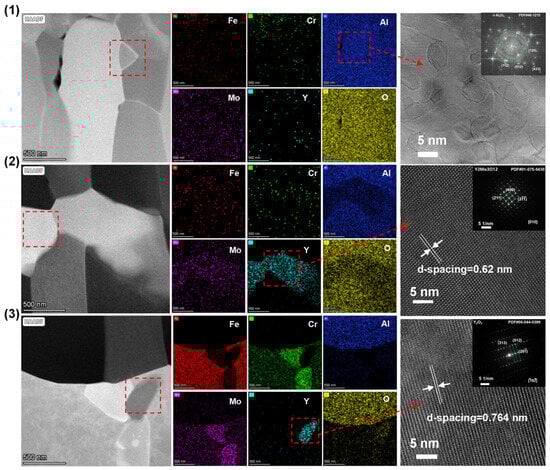 Cross-section HAADF images and elemental analysis of the top surface multiple alteration layer (1–3) corresponding to zones 1–3 in Figure 12; high-resolution STEM analysis of the Fe13Cr6Al1Mo0.15Y subjected to high-temperature steam oxidation (1300 °C) corresponding to the red square zones and the corresponding SADP used on the multiple layer.