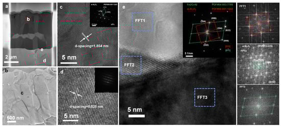 High-resolution STEM analysis of the Fe13Cr6Al1Mo0.15Y sample coupon used on the oxidation layer post-1300 °C steam oxidation and the corresponding FFT images of the different zone ranges from the oxidation layer to the matrix underneath. (a) The brightfield TEM image of the FIB sample lamella; (b) the brightfield TEM image focused on the interplanar layer; (c) high-resolution STEM image corresponding to the grain in b; (d) high-resolution STEM image corresponding to the matrix below the oxidation layer; (e) high-resolution STEM images and corresponding FFT patterns for the interface between oxidation layer and matrix.