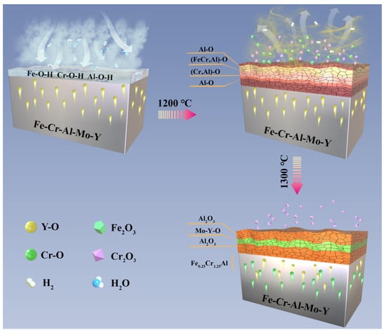 Schematic illustration of the surface alteration and evolution mechanism of the FeCrAlMoY alloy post-high-temperature steam oxidation.