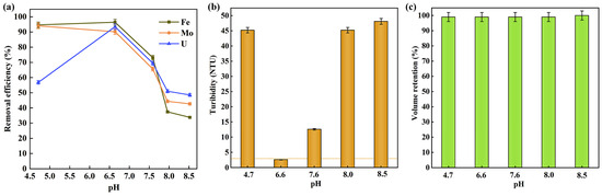 The changes in the removal efficiencies of molybdenum, uranium, and iron with varying pH values are shown in Figure 3a. The removal efficiency of U was only 56.8% at pH 4.7 and reached a maximum of 93.5% at pH 6.6, at which the molybdenum and iron removal efficiencies also reached 90.2% and 96.5%, respectively. When the pH increased beyond 6.6, the removal efficiencies of molybdenum and uranium began to decrease, possibly due to the dissolution of metals and the weakening of the positive charges on Fe(OH)3 colloids [32]. The effects of pH on the turbidity and volume retention of treated water are depicted in Figure 3b,c. Under acidic (pH 4.7) or alkaline (pH 8.0 or 8.5) conditions, the turbidity of the treated water remained above 40 NTU, indicating insufficient separation of fine solids during the flotation process. When the pH was adjusted to 6.6, the turbidity decreased to as low as 2.6 NTU, meeting the drinking water quality standard (3 NTU), while the water loss to foams was negligible, reaching only 1.0%.