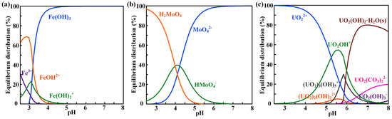 Equilibrium distributions of the species in dilute solutions containing 0.6 mmol·L−1 Fe(III) (a), 1.1 μmol·L−1 U(VI) + 0.25 mmol·L−1 CO32− (b), and 8.8 μmol·L−1 Mo(VI) (c).