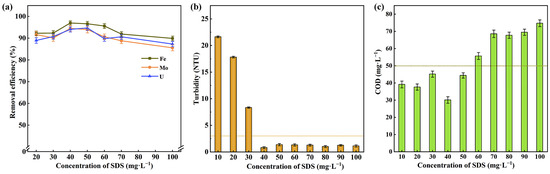 Effects of the SDS dosage on the metal removal efficiency (a), turbidity (b) and COD (c) of treated water. (The dotted line indicates the water quality standard (3 NTU, 50 mg·L−1) requirement for turbidity and COD).