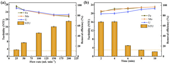 The gas flow rate is related to the size and residence time of the bubbles in the solution, as well as the collision probability between the bubbles and the particles [35], thereby affecting the flotation efficiency. The metal removal efficiency tended to decrease with increasing gas flow rate from 25 to 200 mL·min−1 (Figure 7a). The changes in bubble size with respect to the air flow rate are also displayed in Figure S1. With high gas flow rates, the resulting large bubbles floated and ruptured quickly, preventing them from making full contact with the particles. At a low gas rate of 25 mL·min−1, the resulting micron bubbles (100–300 μm) were more active and remained in water for longer, thereby firmly adhering particles to achieve removal efficiencies of over 94.0% for molybdenum and uranium, as well as over 97.5% for iron. The turbidity of the treated water increased with increasing gas velocity owing to the increasing retention of Fe(OH)3 in the solution. The flotation time is also an important indicator of flotation efficiency. As shown in Figure 7b, during the flotation period from 2 to 10 min, the removal efficiency gradually increased from 83.1% to 96.6% for molybdenum and from 88.3% to 93.6% for uranium, and the turbidity of the treated water gradually decreased to 2.1 NTU. Therefore, a gas flow rate of 25 mL·min−1 and a flotation time of 10 min can provide the best separation efficiency.