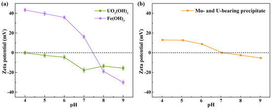 Variation in zeta potential with pH for different precipitates: (a) Fe(OH)3 formed in 0.6 mmol·L−1 Fe3+ solution and UO2(OH)2 formed in 261 µg·L−1 UO22+ + 155 mg·L−1 HCO32− solution; (b) Mo- and U-bearing precipitates from actual wastewater.
