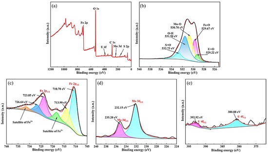 XPS spectra of flotation foam: (a) full spectrum; (b) O 1s peak; (c) Fe 2p peak; (d) Mo 3d peak; (e) U 4f peak.