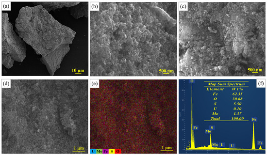 The microstructure and elemental composition of the flotation foam were analyzed, as shown in Figure 12. The foam product primarily consisted of loose and porous bulk particles with a size of approximately 50 μm, indicating secondary flocuation of precipitates in the presence of SDS or the coating of SDS on bulk Fe(OH)3 particles. The EDS results reveal a uniform distribution of sulfur and oxygen on the particle surface. The SDS content, which is converted from the sulfur content (5.5 wt.%), is estimated to be 49.6 wt.%, demonstrating the sustained adsorption of SDS on the Fe(OH)3 particles. Additionally, small amounts of molybdenum and uranium are also identified via EDS, confirming the synergistic separation of metals during the flotation process.