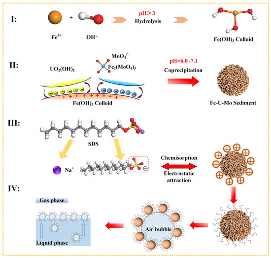 The collaborative separation of Mo and U from wastewater mainly comprises four physical or chemical processes, as depicted in Figure 13. The addition of ferric salt initially turns the wastewater into a weakly acidic solution. As the pH increases, Fe3+ largely hydrolyzes to yield positively charged Fe(OH)3 colloids, while MoO42− and UO22+ combine with Fe3+ and OH− to form negatively charged Fe2(MoO4)3 and UO2(OH)2 precipitates, respectively. Due to electrostatic attraction, Fe(OH)3 colloids and fine particles of Fe2(MoO4)3 and UO2(OH)2 aggregate into large particles. Subsequently, ionized SDS is attracted to precipitates, with its sulfonic acid group attached to the particle surface, while the hydrophobic chain faces the aqueous environment. Finally, with the introduction of air, the precipitates adhere to bubbles via the hydrophobic ends and ascend with them to achieve separation from the liquid phase.