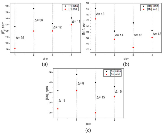 | Alloy | Pinitial/Pend | ΔP, wt% | Mninitial/Mnend | ΔMn, wt% | Sninitial/Snend | ΔSn, wt% |