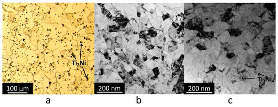 The microstructure of TiNi SMA in the initial state (a), after SPD (b), and after SPD and ageing (c) is shown in Figure 1.