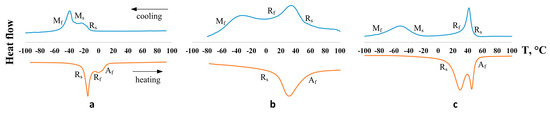 The characteristic temperatures of forward and reverse MTs are calculated through differential scanning calorimetry. Based on the data obtained, calorimetric curves are plotted (Figure 2), and the characteristic temperatures of the MT are determined (Table 1).