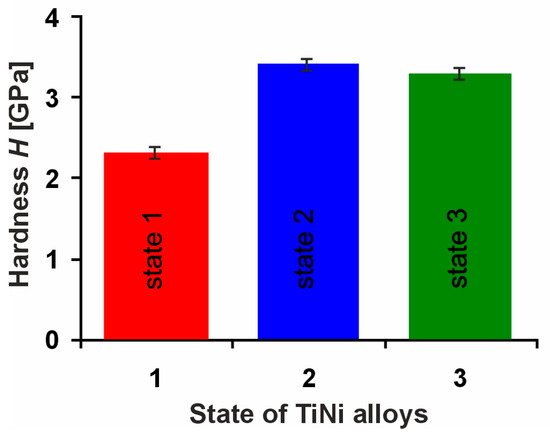 Figure 3 shows that structural refinement causes an almost 50% increase in hardness: from H1 = 2.31 ± 0.1 GPa (state 1) to H2 = 3.42 ± 0.1 GPa (state 2). The observed increase in hardness with a decrease in the average grain size is qualitatively consistent with the Hall–Petch law. Post-deformation annealing of samples at a temperature of 430 °C does not cause noticeable (taking into account the error limits) changes in hardness. TiNi SMA in state 3 (H3) has a hardness of 3.29 ± 0.1 GPa (Figure 3).