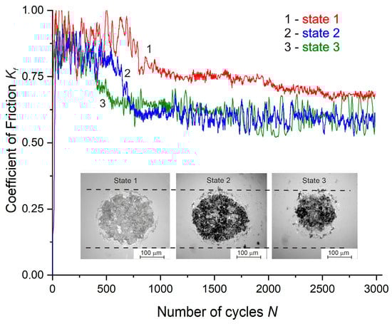 The typical dependence of the friction coefficient Kf on the number of cycles N of reciprocating motion of the counterbody for TiNi SMA in states 1, 2, and 3 is shown in Figure 4. It can be seen that the running-in stage with the maximum value of the friction coefficient for all three studied structural states ends after 500–800 cycles. Furthermore, the Kf(N) dependencies clearly demonstrate that SPD contributes to a decrease in the friction coefficient from Kf1 = 0.71 ± 0.02 (state 1) to Kf2 = 0.57 ± 0.02 (state 2). Moreover, a decrease in grain size causes an almost 20% decrease in the coefficient of friction of the alloy, measured at the stage of steady wear. The friction coefficients of the TiNi SMA in states 2 and 3 are practically the same and equal to 0.57 ± 0.02 and 0.56 ± 0.02, respectively. Additionally, annealing (ageing) of the TiNi SMA in the NS state at a temperature of 430 °C does not cause changes in the friction coefficient.