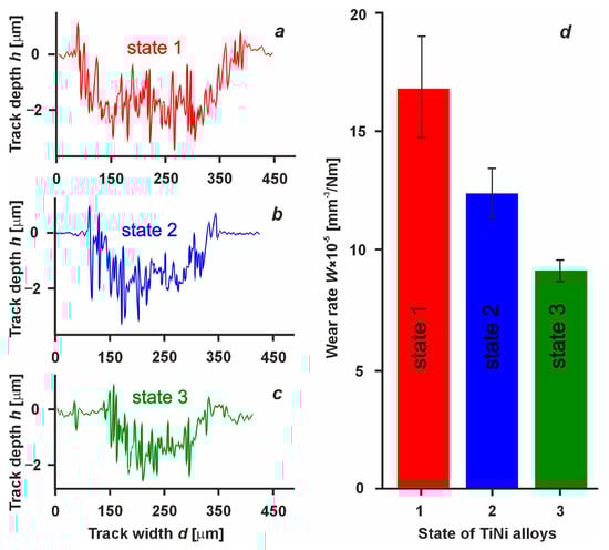 Typical profilograms of track cross-sections (wear traces) formed as a result of friction of the TiNi SMA in the studied structural states 1, 2, and 3 are presented in Figure 5a–c. It can be seen that the alloy in the CG state has the largest area (width and depth) of the track cross-section, and the alloy in the NS state after annealing has the smallest one.