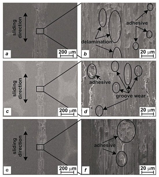 where V—the volume of removed material (mm3), calculated as the product of the track length and its cross-sectional area, which was determined using a profilometer (Wyko NT9080, Germany). The morphology of the tracks was studied using a Merlin high-resolution scanning electron microscope (Carl Zeiss, Germany). Moreover, elemental analysis was performed on a JCM-7000 scanning electron microscope (JEOL, Japan) using energy-dispersive spectrometry.