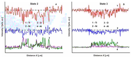 Elemental analysis of the samples indicates quantitative differences in the chemical composition inside and outside the track. For example, Figure 7 shows the intensity distributions of signals from Ti, Ni, O, and Al along a line cutting the track at an angle of 90°, obtained by energy dispersive spectrometry. The observed changes in signal intensities reflect (at a qualitative level) changes in the relative proportions of the corresponding chemical elements. Moreover, it can be seen that inside the track (in the area of the worn surface), there is a decrease in the relative proportions of Ti and Ni and an equivalent increase in the content of O and Al. Notably, the signal intensities from O and Al outside the track (in the region of the undeformed surface) are recorded only at the noise level.