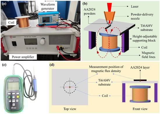 The experiment used a self-designed powder-based L-DED system, which has been described in detail in reference [10]. Figure 2a shows the device for generating an alternating magnetic field, which consisted of a coil, a waveform generator, and a power amplifier. A sine-wave signal was generated by the waveform generator. When conducting the L-DED experiments, the coil was placed directly below the substrate to generate an axial alternating magnetic field, as shown in Figure 2b. A handheld Gauss meter was used to measure the magnetic flux density of the alternating magnetic field at the surface position of the substrate, as shown in Figure 2c. Considering the non-uniform distribution of alternating magnetic fields in space, and in order to ensure the accuracy of the experimental results, the measurement position of each experiment was located at the intersection position of the upper surface of the Ti6Al4V substrate and the coil axis, as shown in Figure 2d. During the L-DED process, the AA2024 deposition layer passed through this measurement point, and all samples for subsequent cross-sectional analyses were taken from this location. The parameters used in the experiment are shown in Table 3.