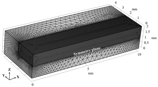 To study the influence mechanism of an externally applied magnetic field on the formation of IMCs, a three-dimensional CFD model that coupled heat transfer, fluid flow, and a magnetic field was established. In order to save computational costs, a symmetrical model with dimensions of 10 mm × 4 mm × 2 mm was used in the calculation. The mesh model used for the analysis is shown in Figure 3. Finer meshes in the deposition region were used to improve the computational efficiency, while the region far from the center of the heat source was calculated with coarser meshes. Due to the complex working conditions of the alternating magnetic field-assisted L-DED process, some basic assumptions needed to be made for the model during the numerical simulation [27,28]:
