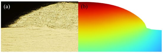 Figure 4a,b show the comparison between the numerical and experimental profiles of the cross-section of the Ti6Al4V/AA2024 dissimilar material deposits prepared by L-DED without applying a magnetic field. It can be seen that the cross-sectional profile predicted under the simulated conditions was basically consistent with the experimentally obtained one, indicating that the numerical model used in this paper was accurate. On this basis, the effect of the AMF on the temperature and fluid flow of the melt pool was calculated.