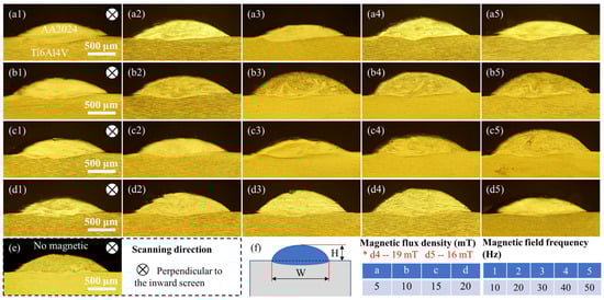 Macroscopic morphology in bright-field mode. (a–d) the magnetic flux densities are 5 mT, 10 mT, 15 mT, and 20 mT, respectively, with the magnetic flux density from left to right (1–5) are 10 Hz, 20 Hz, 30 Hz, 40 Hz, and 50 Hz, respectively; (e) no magnetic; (f) schematic of width and height of AA2024 deposition layer.