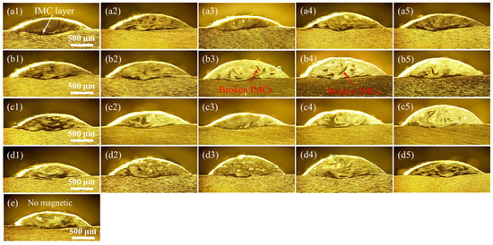 In Figure 6, it can be observed that the shape and distribution of the IMCs at the interface underwent significant changes after the addition of an alternating magnetic field. However, the morphologies of the IMCs in the deposits obtained with several magnetic field parameters were very different from those obtained without a magnetic field, such as b3–b5, c4–c5, etc. The most representative one shown in Figure 6(b4) (with a magnetic flux density of 10 mT with a frequency of 40 Hz) was then selected for subsequent analysis.