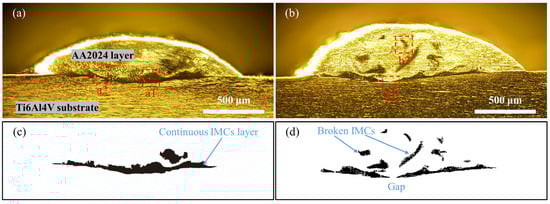 Figure 7a,b show the dark-field images of the optical microscopy for the Ti6Al4V/AA2024 deposits without applying an alternating magnetic field and with a magnetic flux density of 10 mT and a frequency of 40 Hz, respectively. To better analyze the impact of alternating magnetic fields on IMCs, MATLAB programming was used to process the images in the dark-field mode. Figure 7c,d are binary images of the IMCs extracted from the processed images of Figure 7a and 7b, respectively. The changes in the IMCs are more discernable in the processed figures. The IMC layer in Figure 7c, without applying an alternating magnetic field, was continuous and roughly uniformly distributed along the Ti6Al4V/AA2024 interface and has a relatively thick thickness. After applying an alternating magnetic field, it can be observed that the IMC layer at the Ti6Al4V/AA2024 interface in Figure 7d was no longer continuous, with a gap and a significant decrease in thickness. In addition, some broken IMCs were also found in the AA2024 deposition layer, which was believed to be caused by the stirring effect of the melt pool arising from the alternating magnetic field [33,34]. In addition, the area of the AA2024 deposition layer and extracted IMCs in Figure 7 were measured using the Image-Pro software.6.0 Quantitative analysis was conducted by calculating the ratio of the area of IMCs to the entire area of the AA2024 deposition layer. The results indicate that the ratio of IMCs to the deposition area of AA2024 in Figure 7a, without applying an alternating magnetic field, was 16.9%. After applying an alternating magnetic field with a density of 10 mT and a frequency of 40 Hz, the ratio decreased to 9.7%. Therefore, applying an alternating magnetic field can effectively regulate the distribution and mitigate the content of IMCs.
