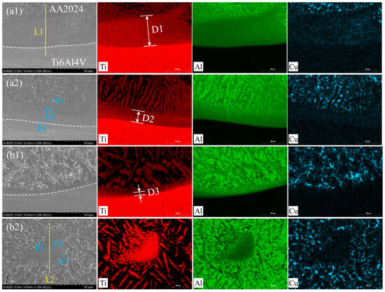 The IMCs at the Ti6Al4V/AA2024 interface were further analyzed using SEM and EDS. Figure 8(a1,a2) are SEM and EDS mapping distribution images of the a1 and a2 regions in Figure 7a, respectively. Among them, Figure 8(a1) shows the area with the maximum thickness of IMCs, while Figure 8(a2) shows the area with the minimum thickness of IMCs. The EDS scanning results indicate that the IMCs were mainly composed of two elements, Ti and Al, located near the AA2024 side at the Ti6Al4V/AA2024 interface. IMCs exist in two forms: as a continuous layer and club-shaped. Club-shaped IMCs were distributed on one side of the continuous IMCs and perpendicular to the continuous IMC layer. The maximum thickness at D1 of the IMCs in the sample without applying an alternating magnetic field exceeded 40 μm, while the minimum at position D2 was close to 15 μm. Figure 8(b1,b2) are the SEM and EDS scanning distribution images of the b1 and b2 regions in Figure 7b, respectively. The stirring effect of the alternating magnetic field on the melt pool caused gaps in the IMC layer at the Ti6Al4V/AA2024 interface, as shown in Figure 7d. The SEM image shown in Figure 8(b1) indicates the presence of a very thin IMC layer at the location of the gap. The thickness at D3 of the IMC layer was less than 5 μm; therefore, it was not discernable in the dark-field mode of optical microscopy and appeared discontinuous. In addition, there were also club-shaped IMCs, as shown in Figure 8(b1), but their orientations were disordered. Figure 8(b2) shows broken IMCs, mostly distributed in flakes in the AA2024 deposition layer. Club-shaped IMCs with different orientations surrounded the sheet-like IMCs. All of these results further indicate that the alternating magnetic field had a stirring effect on the melt pool, affecting the flow of the melt pool.