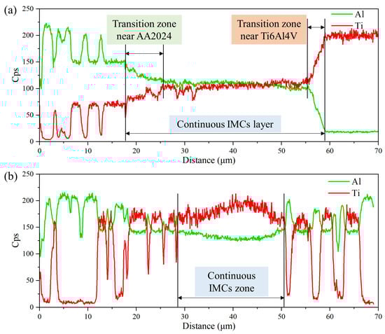 Figure 9a shows the distribution of elements along path L1 in Figure 8(a1). From left to right are the AA2024 layer, continuous IMC layer, and Ti6Al4V layer. Due to the presence of club-shaped IMCs, there were fluctuations in the distribution of Ti and Al elements in the AA2024 layer. There was a transition region between the Ti and Al elements at both ends of the continuous IMC layer. Figure 9b shows the element distribution along path L2 in Figure 8(b2). The results indicate that the middle region of the sheet-like IMCs was a continuous IMC layer, and the distribution of the Ti and Al elements was relatively stable. Violent fluctuations in the Ti and Al elements existed on both sides, which were caused by the club-shaped IMCs. Furthermore, the components of the IMCs at different locations were measured through point scanning, as shown in Table 4. The results indicate that the intermediate positions of both the continuous layer and rod-shaped IMCs were TiAl2 (P1, P3, P5, and P6). The transition region near the Ti6Al4V side of the continuous IMC layer was TiAl (P4), while the transition region near the AA2024 layer side was TiAl3 (P2 and P7).