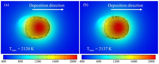 The temperature distributions on the top surfaces of the deposition layers are shown in Figure 10. Figure 10a shows when no AMF was applied, while Figure 10b shows when an AMF was applied, where the magnetic flux density of the AMF was 10 mT and the frequency was 40 Hz. The results indicate that the temperature at the center of the melt pool was the highest, and there was no significant change in the temperature distribution of the melt pool after applying the AMF. The maximum temperature was increased by 17 K by introducing the magnetic field. This may be because the AMF changed the flow pattern inside the melt pool, and the Lorentz force also hindered the flow of the melt pool, ultimately affecting the convection and heat dissipation of the melt pool.
