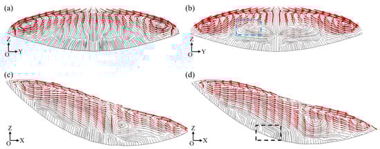 Distribution of streamline lines in cross-section: (a) without an AMF; (b) with an AMF. Distribution of streamline lines in longitudinal section: (c) without an AMF; (d) with an AMF.