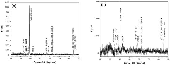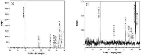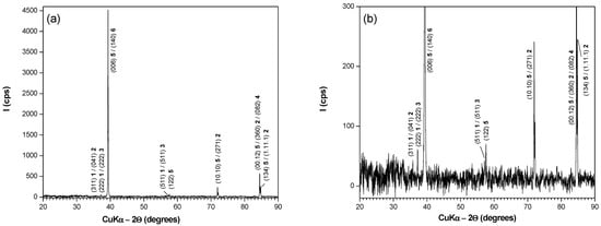 XRD pattern of the external layer of AISI 4140 steel oxidized for 20 min at an isothermal temperature of 1000 °C in atmospheric air, with subsequent air cooling: (a) lower magnification; (b) higher magnification.