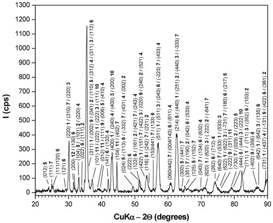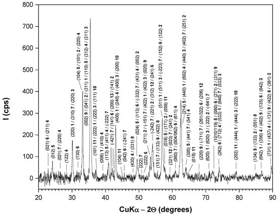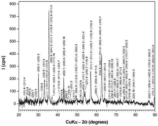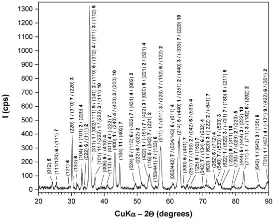 In addition to the previously identified phases, the presence of Fe2SiO4, FeSiO3, MoO3 and Mn2O3 is also indicated by several low-intensity and/or broad peaks, together with contributions from other minor oxides.