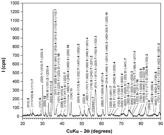 XRD pattern of the external layer of AISI 4140 steel oxidized for 40 min at an isothermal temperature of 1000 °C in atmospheric air, with subsequent air cooling: (a) lower magnification; (b) higher magnification.