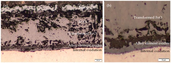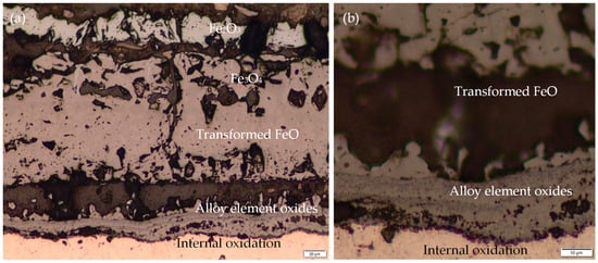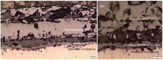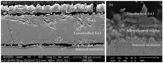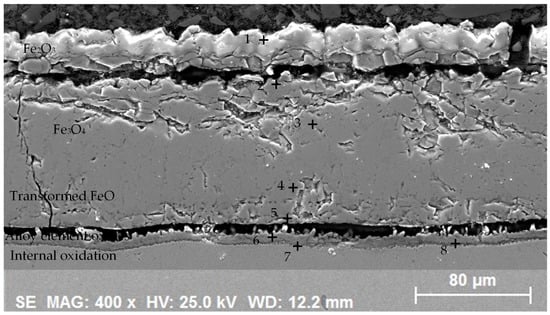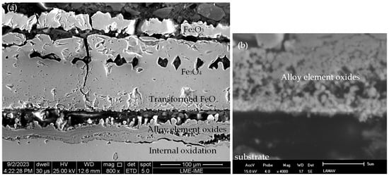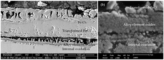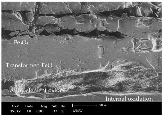 Steel manufacturers incorporate certain alloying elements, such as chromium, silicon, and aluminum, into the steel’s composition to prevent oxidation and diminish the thickness of the scale. The reason for this inclusion is that these elements, which have a greater affinity for oxygen than Fe, form a protective oxide layer on the steel surface. This process is clearly demonstrated by the findings of studies [10,11,12]. The formation of a protective alloying element oxide layer is dependent on the proportion of these elements incorporated into the steel composition. Alloying elements are unlikely to form a continuous film across the entire scale when present in low quantities. Conversely, they accumulate in specific regions. The wustite layer near the scale/substrate region and within the steel is a case in point. This accumulation contributes to a phenomenon known as internal oxidation. It is important to note that even relatively low concentrations of alloying elements can significantly impact the kinetics of other oxide formation in the scale, even in the absence of a continuous film [13,14].