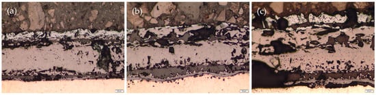 These findings are in accordance with those previously reported by Hao et al. [40]. Similarly, the formation of a cluster of alloying elements near the substrate was observed, as confirmed by XRD, which definitively displayed the presence of complex oxides. The authors do not explicitly state this, but their results clearly show a decrease in oxygen and an increase in iron content as the metallic substrate gets closer. Furthermore, they observed a clear increase in oxygen content in the region containing these complex oxide clusters.