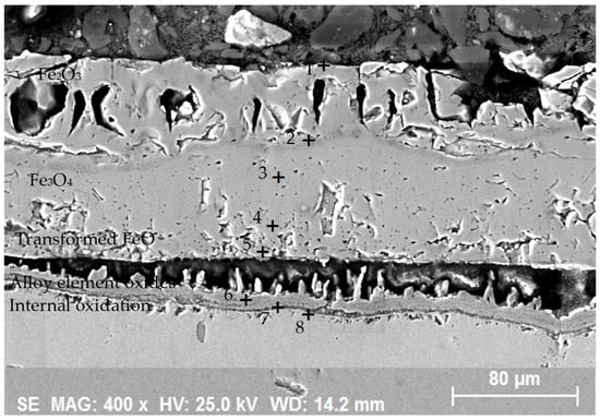 As can be seen, the results are in line with those previously discussed in relation to the sample oxidized for 20 and 40 min. As with the previous observations, the selected points irrefutably demonstrate that the concentration of oxygen tends to diminish as it approaches the substrate. However, an increase in oxygen content is clearly visible when point analysis is conducted in the vicinity of the layer comprising alloying element oxides.
