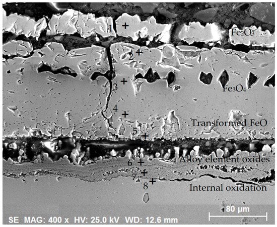 - The oxide layers exhibited a composition of Fe2O3, Fe3O4, and FeO, with the formation of the layer being attributed to a cluster of alloying element oxides, with a greater influence exerted by Fe and FeCr2O4.