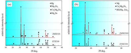 XRD diffraction patterns of extruded samples. (a) ZMT310, ZTX310; (b) ZMXE3101, ZTXE3101.